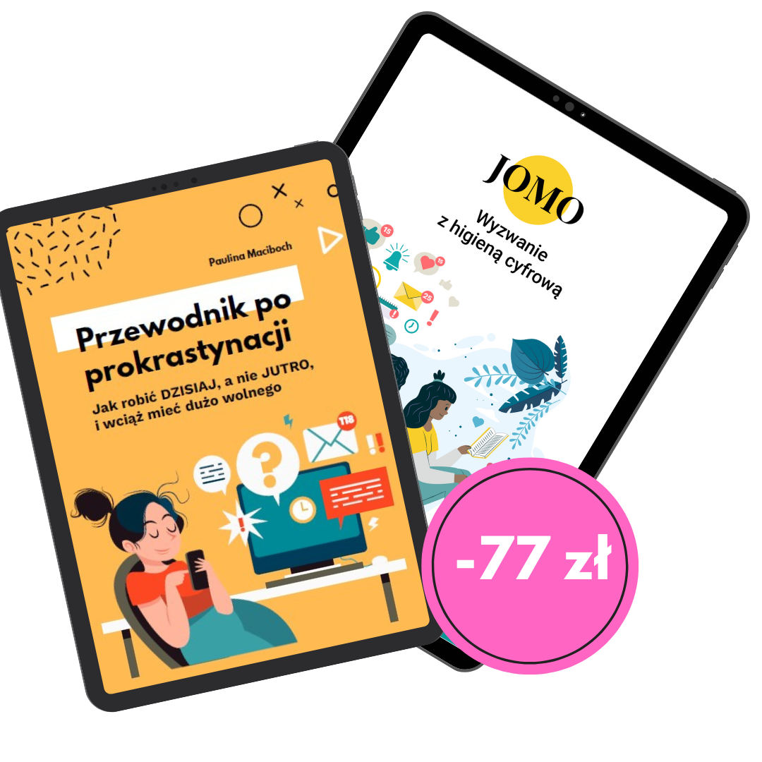 ✅  2-ebooki w pakiecie: jeden pomoże Ci pokonać prokrastynację, a drugi – pokonać FOMO i cieszyć się czasem BEZ SMARTFONA.